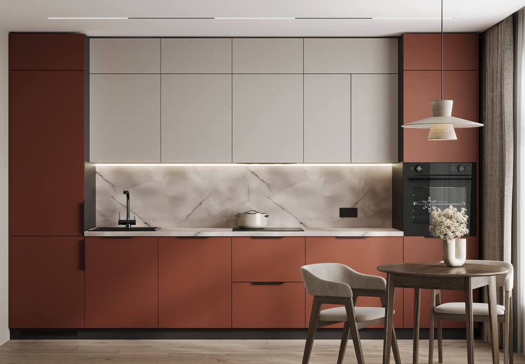 – Основные материалы – ЛМДФ PRIME, EvoGloss. Это современные покрытия с высокой стойкостью к влаге, механическим повреждениям и загрязнениям. Они легко очищаются, не боятся перепадов температуры и при этом выглядят дорого. По соотношению цена/качество – это одни из лучших вариантов на рынке.
